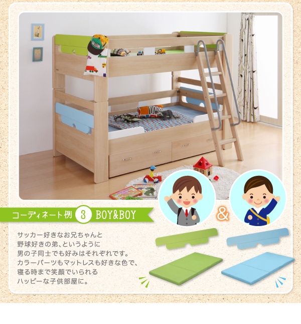 カラーパーツもマットレスも好きな色で、寝る時まで笑顔でいられるハッピーな子供部屋に。