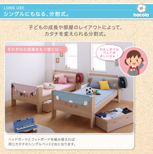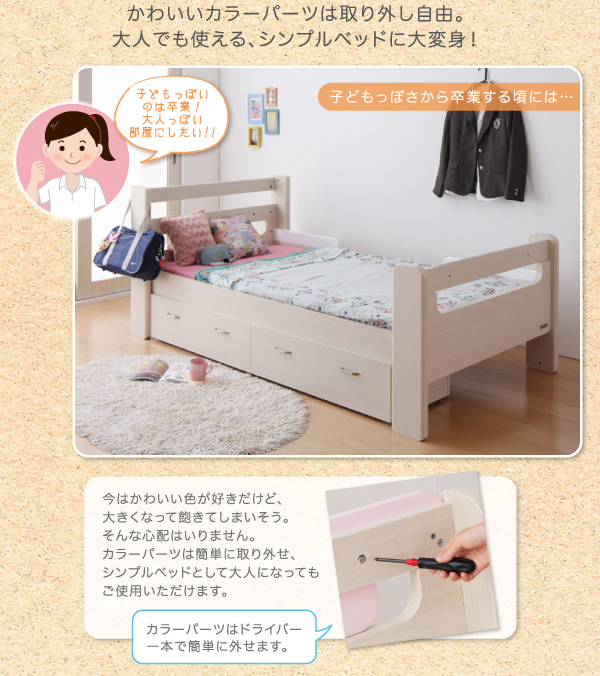 カラーパーツは簡単に取り外せ、シンプルベッドとして大人になってもご使用いただけます。