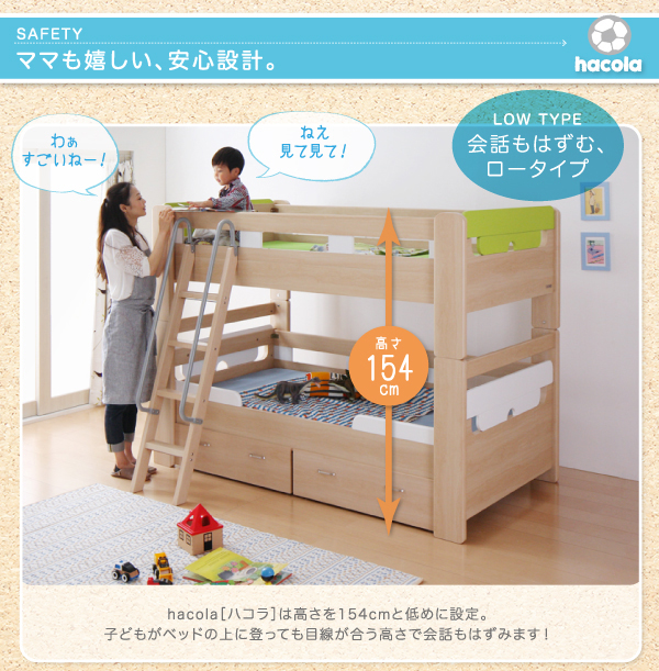 hacola[ハコラ]は高さを154cmと低めに設定。子どもがベッドの上に登っても目線が合う高さで会話もはずみます!