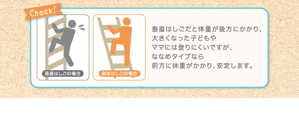 垂直はしごだと体重が後方にかかり、大きくなった子どもやママには登りにくいですが、ななめタイプなら前方に体重がかかり、安定します。