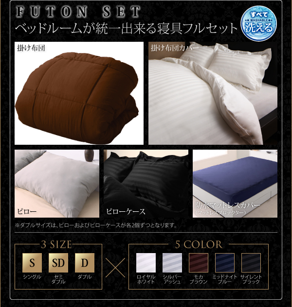 ※ダブルサイズは、ピローおよびピローケースが各2個ずつとなります。