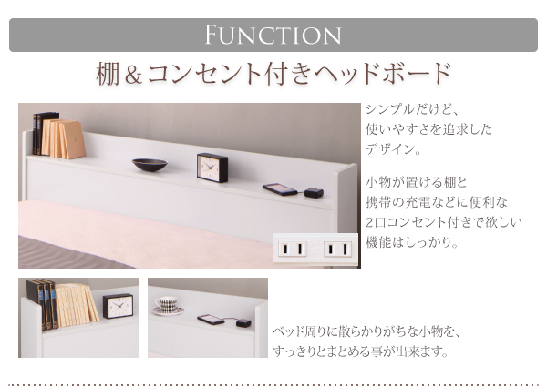 小物が置ける棚と携帯の充電などに便利な2口コンセント付きで欲しい機能はしっかり。