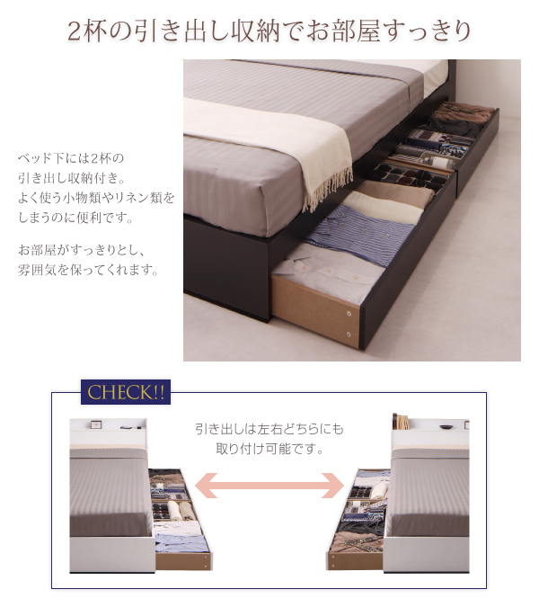 ベッド下には2杯の引き出し収納付き。