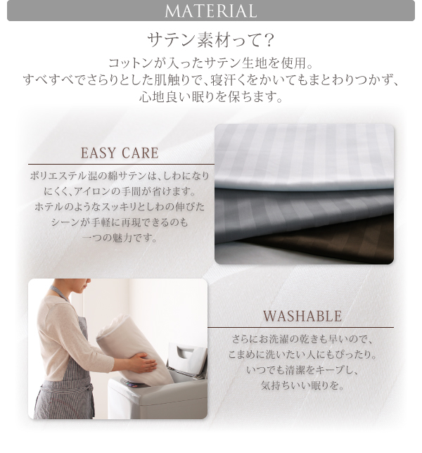 ポリエステル混の綿サテンは、しわになりにくく、アイロンの手間が省けます。